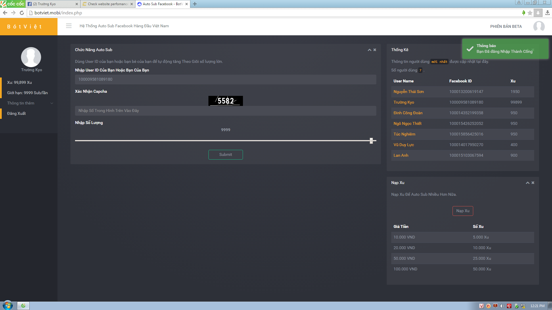 – Panel Admin: Nếu bạn là admin thì panel này sẽ giúp bạn quản lí site một cách dễ dàng nhất bao gồm các thao thác: Sửa limit sub của user, Sửa Xu của user, Sửa Vip Sub, v.v..